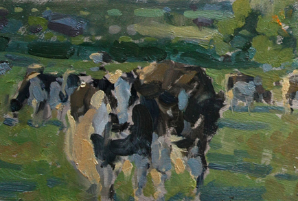 End of the day, warm sunlight, itching to get out and paint, thought it would be a nice challenge to paint the moving cows and fading light! Actually, it was fun, high energy stuff. Rough round the edges, perhaps a little crude but who cares! Soaking up the moment, that’s what it’s all about. Check out the strokes in the grass.