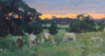 End of the day, warm sunlight, itching to get out and paint, thought it would be a nice challenge to paint the moving cows and fading light! Actually, it was fun, high energy stuff. Rough round the edges, perhaps a little crude but who cares! Soaking up the moment, that’s what it’s all about. Check out the strokes in the grass.