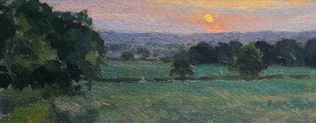 I was keen to do a small, wide format of the view from Whaddon at twilight, whilst the fields were nice and ripe. It was quite a challenge to get the balance of colours and values. As ever, the light seemed to change almost every time I looked up but the hardest part was getting the sky colours to read sensibly as paint. I found I didn’t need to actually paint the sun as bright as it is (which would be impossible anyway!) by controlling the colours around it.
