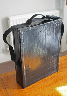 I opted for a hand carrier strap (as opposed to a shoulder one) and attached it with lots of glue/strapping to secure it. It’s got a velcro fastener so it can be undone or adjusted if necessary. The variable widths were built up with strips of foamboard glued together into solid blocks and on the outside I used plastic edging strips wherever two edges meet to provide more strength.
